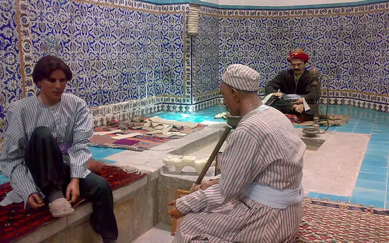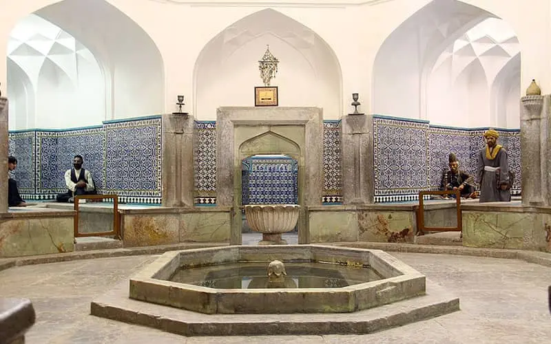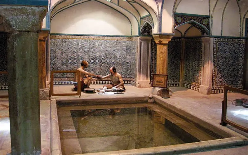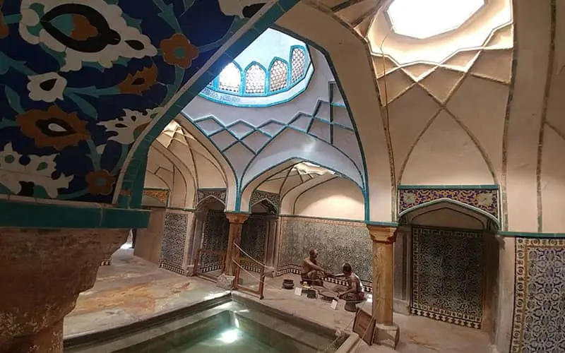 همچنین، معماران با استفاده از کاشیها و سنگهای خوشرنگ و زیبا به سراسر این حمام نمای چشمگیری دادهاند. سقف رختکن نسبتا بلند و بر ستونهای مستحکم استوار است. علاوه بر غرفههایی که دور رختکن قرار گرفتهاند، حوض زیبایی در وسط این غرفهها خودنمایی میکند. فوارهای که در مرکز این حوض تعبیه شده، موسیقی دلنوازی را به قلب و دل بازدیدکنندگان هدیه میدهد.